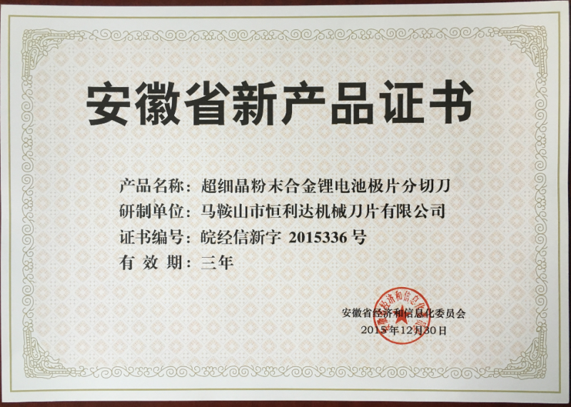 新產(chǎn)品證書2015